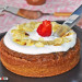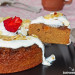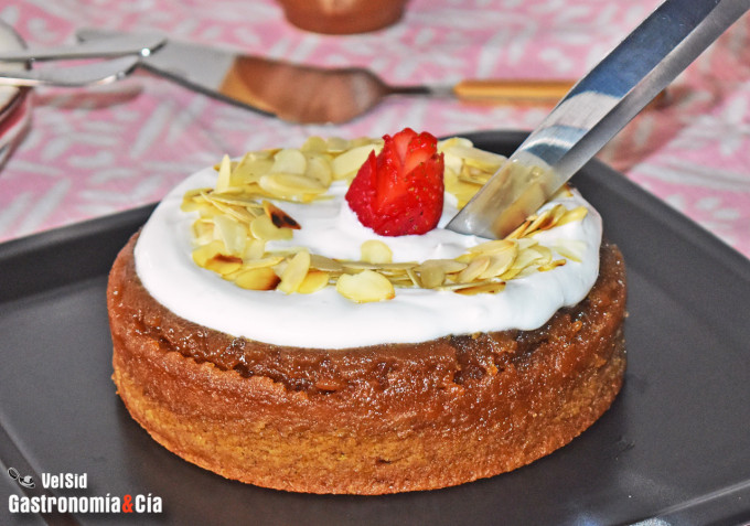 Presenta el bizcocho de calabaza en una bandeja o tartera. Endulza el yogur colado con sirope de arce y cubre con él el bizcocho. Termina decorando con las almendras tostadas y a disfrutar. ¡Buen provecho!