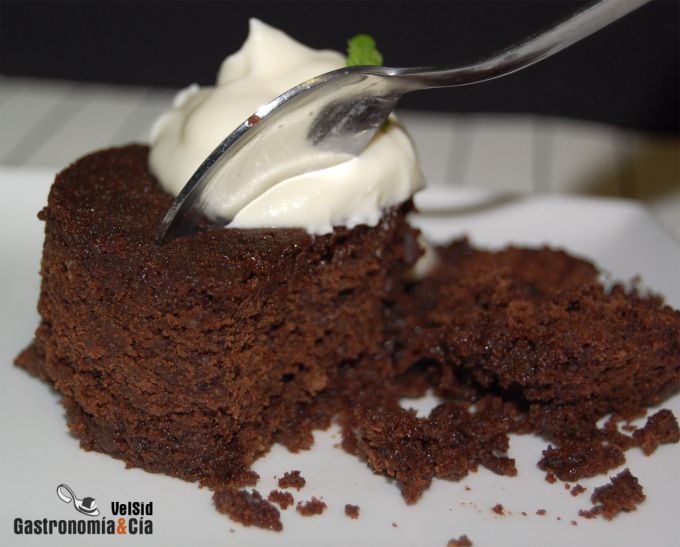 Una vez que el Bizcocho de chocolate borracho se ha enfriado y reposado, vuélcalo sobre una bandeja córtalo en porciones (deberás manipularlo con cuidado) y sírvelo acompañado con un par de cucharadas de nata, que también puedes presentar de forma más llamativa con ayuda de una manga pastelera. ¡Os vais a chupar los dedos!