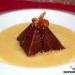 Sirve en un plato de postre hondo un cucharón de sopa de naranja y jengibre, coloca en el centro el bizcocho de chocolate y corona la pirámide con el kumquat confitado. Baña con un par de cucharadas del almíbar y termina espolvoreando un poco de almendra rallada.