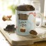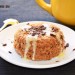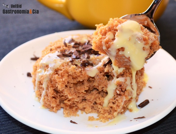 Una vez hecho el bizcocho, desmóldalo en un plato o preséntalo en la misma taza, puedes completarlo con un poco de salsa de chocolate blanco o negro, con mantequilla de manzana, con caramelo de mantequilla salada, con virutas de chocolate… al gusto.