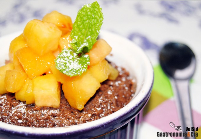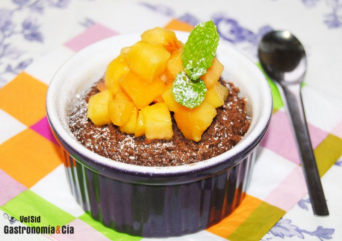 Puedes desmoldar los bizcochos, pero la idea es presentarlos en los ramequines, reparte sobre cada bizcocho de chocolate suave un par de cucharadas de melocotón o del complemento elegido. Puedes decorar con unas hojas de hierbabuena o con caramelo hilado.