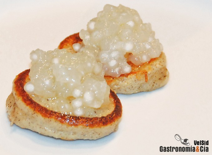 Disponer en el plato los blinis calientes y encima servir las perlas de tapioca (tiene que estar fría) aliñadas con aceite de oliva virgen extra y dos escamas de sal.