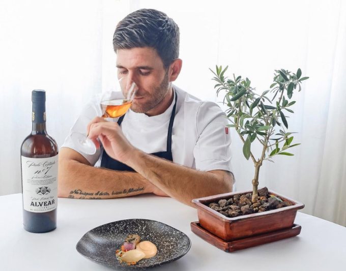 En la cocina del Restaurante Terra Olea de Córdoba, los productos que entran son los de proximidad y de temporada, además, en su entorno hay abundancia de productos con Denominaciones de Origen y otras marcas de calidad, incluidos los vinos. Y con uno de ellos es con el que se elabora la propuesta que hoy tenéis en la sección ‘Recetas del Chef’. Sobre estas líneas podéis ver la elegante presentación del Bloody Mary de Palo Cortado del chef Paco Villar.