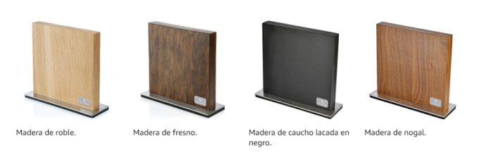 En la siguiente imagen podéis ver que hay cuatro modelos para poder elegir el que mejor quede en nuestra cocina, son bloques de madera de roble, de fresno, de nogal y de caucho lacada en negro. Son macizos y cuentan con fuertes tiras magnéticas en el interior de cada lado del bloque, por eso se puede utilizar por los dos lados, y la base es de acero inoxidable con un acabado de fieltro para proteger la encimera, sea del material que sea.