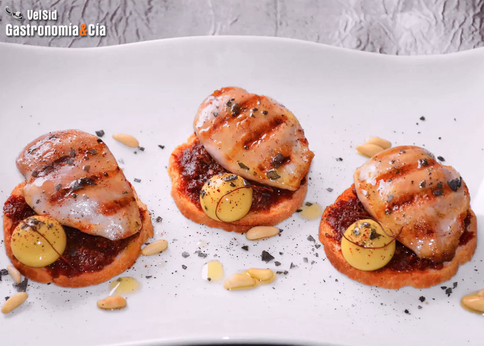 Pinta un plato con un poco de mermelada de tomate (también le va bien la mermelada de higo, de fresa…), coloca a continuación los bocados de foie gras con almendra y termina colocando las tejas de queso rotas y una ramita de eneldo para decorar. ¡Buen provecho!