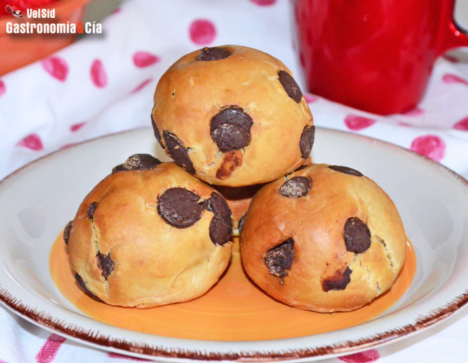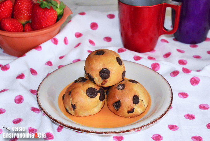 Incorpora las gotas de chocolate para que se repartan en la masa y después haz cuatro porciones de unos 60 gramos aproximadamente. Forma una bolita con cada pieza y pincélala con un poco de leche para que tenga mejor color tras la cocción.
