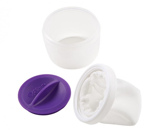 El que os mostramos hoy es diferente, es la bolsa para espolvorear de Wilton, y está especialmente pensada para espolvorear azúcar glas o almidón de maíz en ciertas elaboraciones de repostería y pastelería artística, como la pasta de azúcar o fondant. Si trabajáis con estos ingredientes sabréis de la necesidad de espolvorearlos para evitar que se peguen a la mesa de trabajo o a los utensilios, como el rodillo, los cortadores, los moldes de silicona, etc.