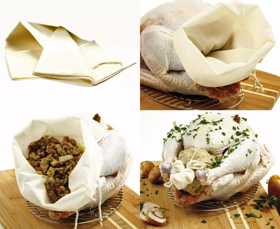 Ambos productos son prácticos y económicos, pero si queréis alternativas podéis valorar las bolsas reutilizables de Norpro diseñadas para contener el relleno de las aves asadas. El material de la bolsa es 35% algodón y 65% poliéster, se puede lavar después de su uso tanto a mano como en la lavadora. Sus medidas son de 43 x 25’5 centímetros, suficiente para introducir el relleno de un pavo, que suele ser el ave más grande que solemos elaborar.