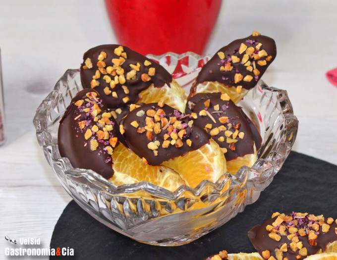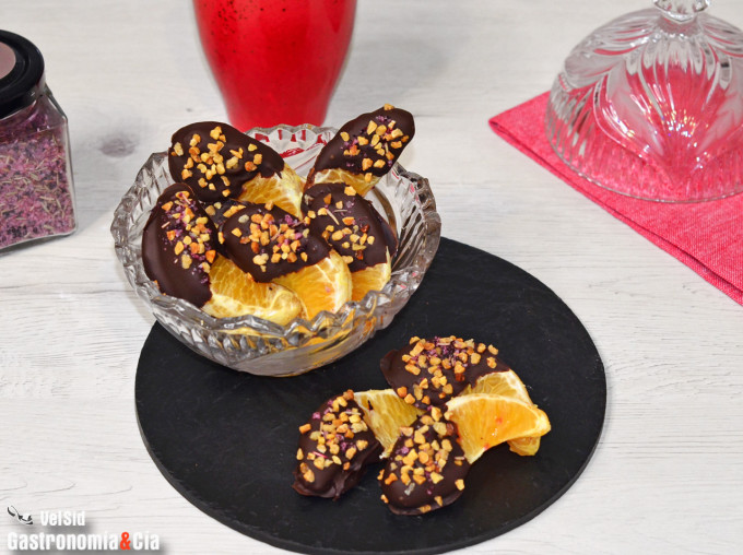 Podemos llamarles bombones, gajos, bocaditos… en cualquier caso, cuando probéis estos dulces de chocolate, naranja natural y sal de hibisco y romero os van a encantar, y lo mejor de todo es que son muy fáciles y rápidos de elaborar. O quizá lo mejor sea que esta idea se puede trasladar a cualquier fruta y en cualquier temporada, pues se puede hacer con naranjas, fresas, plátanos, mandarinas, peras, manzanas… hasta con sandía, la combinación con el chocolate negro y el toque de sal aromatizada es armonía con cualquier fruta.
