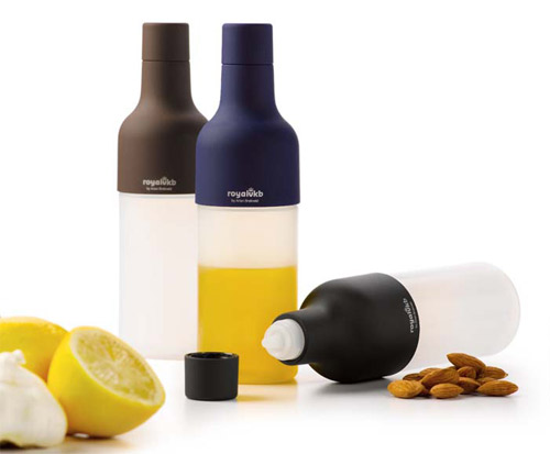 Las botellas o vinagreras Royal VKB tienen unas medidas de 6 x 20 cm. aproximadamente, están fabricadas en polipropileno y plástico, y disponibles en varios colores, negro, azul y marrón, además, han realizado una versión más elegante que combina la flexibilidad de la botella con el acabado en acero inoxidable.