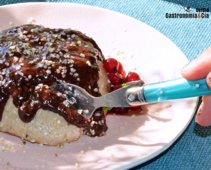 Para terminar, añade las semillas de cáñamo peladas y tritura unos segundos para que quede un poco más fino, pero no totalmente molido. Vierte la preparación en un bol apto para microondas y añade las gotas o chips de chocolate negro.