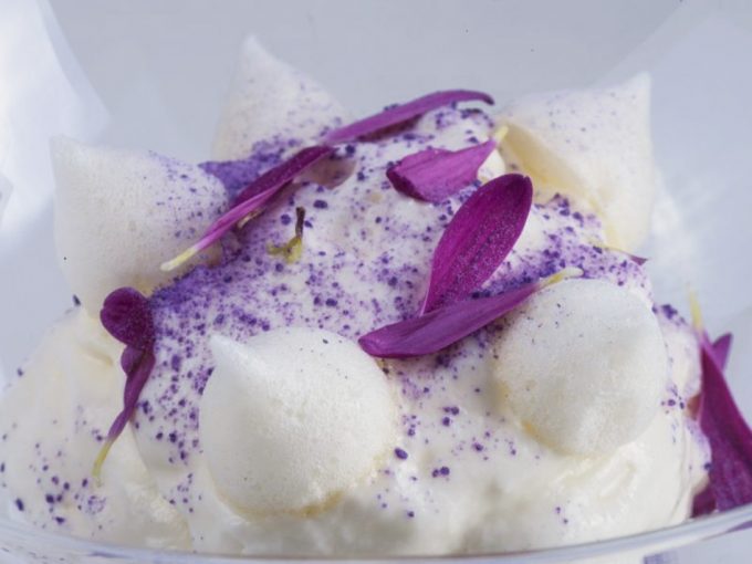 Pues a ver qué os parece este plato de brandada que se compone de las materias primas tradicionales, bacalao, patata, ajo, nata… pero que se presenta de forma muy diferente, el ajo en forma de merengue seco y crujiente, el bacalao en forma de mousse, y entre otras cosas, lo que podéis ver en la foto de color violeta (además de los pétalos), es polvo de esta variedad de patata. Si queréis sorprender a vuestros comensales con un plato que conjuga tradición y vanguardia como esta brandada de bacalao y merengue de ajo de Iván Cerdeño, tomad nota de la elaboración paso a paso a continuación.