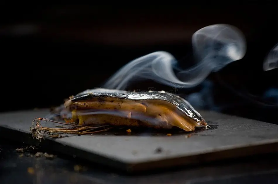 Corta un trozo de brioche de 5 cm de largo, 1’5 cm de ancho y de 0’5 cm de grosor. Dóralo ligeramente en una sartén antiadherente y coloca sobre él una loncha de foie asado que sea lo más fina posible, y cúbrela con la piel de sardina. Pincha encima una ramita de tomillo seco y enciéndelo para potenciar el sabor y el aroma de las hierbas asadas.
