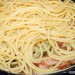 Cuando la pasta esté al dente, escúrrela reservando un vaso del agua de cocción. Vierte la mitad de este agua a la sartén de la panceta que ya estará sonrosada y la grasa transparente, incorpora a continuación los bucatini, sube el fuego y saltea un minuto, mientras vas moviendo para que la pasta se impregne de la grasa y el sabor de la panceta.