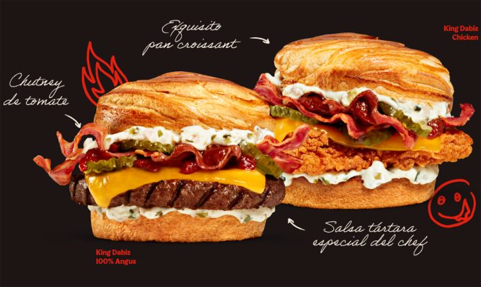Las nuevas hamburguesas “KING DABIZ” se presentan como si fueran lo mejor de la cadena de comida rápida, hamburguesas con estrella creadas por el rey de la disrupción en la cocina y por Burger King. Ambas hamburguesas son prácticamente idénticas, están elaboradas con pan de croissant, salsa tártara especial del chef, chutney de tomate, bacon, pepinillos y queso cheddar madurado, lo único que cambia es la carne, pollo o Angus.