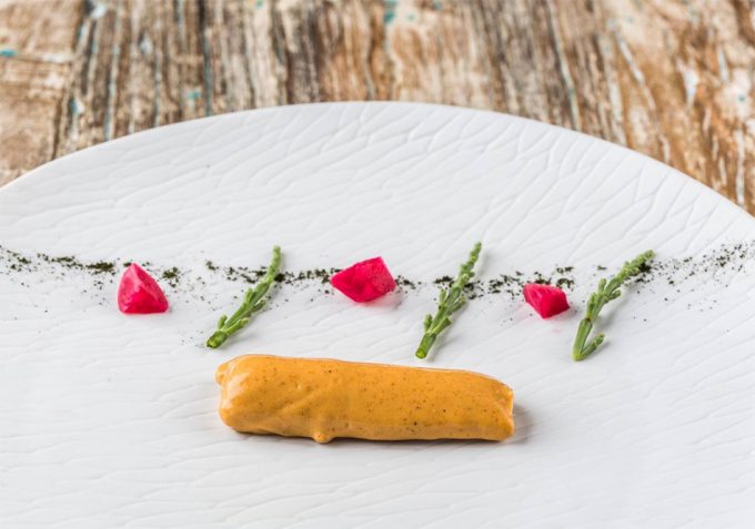 La caballa en adobo es uno de los clásicos de la gastronomía gaditana, es una deliciosa fritura que conquista todos los paladares, sean amigos del pescado o no tanto. Pero de la ‘cabesa’ del chef de Aponiente sale una reinterpretación que podéis ver ilustrando estas líneas. Ángel León prepara su caballa en adobo sin fritura, el pescado está adobado deliciosamente, pero cocinado a baja temperatura, dando como resultado un pescado jugoso, lleno de sabor y con una finura sin igual.