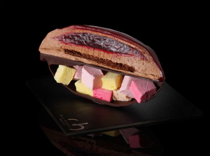 Esta brillante presentación del Cacao en dos tiempos de Oriol Balaguer se compone de un bizcocho de chocolate, un gelificado de frambuesa, una mousse ligera de chocolate y unas nubes de colores (al gusto) que se esconden en el interior de un haba de cacao de chocolate para las que se precisa del molde y de un poco de práctica en el trabajo con chocolate. Todo es empezar, así que si os gusta la pastelería de autor, os va a encantar esta propuesta del pastelero catalán. Por cierto, los chocolates Ob son chocolates con su propia marca, podéis verlos aquí.