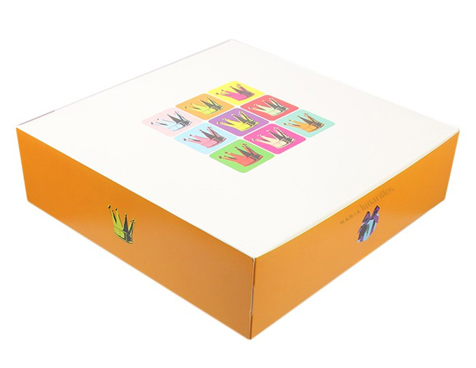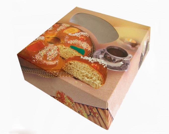 La foto que podéis ver encabezando estas líneas es la de una caja para Roscón de Reyes de estilo clásico, con ventana para ver el interior, y es para piezas pequeñas, roscones de un cuarto de kilo, sus medidas son de 23 x 23 centímetros. Con esta caja se incluye el kit para el roscón, es decir, el Rey, el haba y la corona, los dos elementos que se introducen en la masa antes de hornear y la corona con la que se alzará el comensal que descubra el Rey en su porción. El precio de esta caja es de 2’50 euros, puede parecer económica pero hay otras opciones que os pueden gustar más.