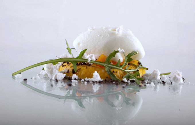 El plato Calabaza, queso, rúcula y ajo negro de Pepe Solla se compone de un suave puré de calabaza acompañado de un helado de queso de cabra curado (elige para ello un excelente queso gallego, como no podía ser de otra forma) y, además, de un polvo de aceite de rúcula y un polvo de ajo negro que ofrecerán distintos matices de sabor y textura en cada bocado. Os animamos a que toméis nota de esta receta del chef gallego porque disfrutaréis poniendo en práctica algunas técnicas culinarias y descubriendo que no hace falta mucho para hacer un gran plato y sorprender a vuestros comensales.