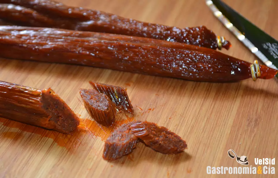 Calabizo de un producto procesado que, para su elaboración, pasa por un tratamiento similar al que se realiza para elaborar los chorizos tradicionales, está curado y además ahumado con madera de roble, pero a primera vista, como podéis ver en la fotografía, recuerda más a la chistorra por su forma alargada y fina. Para elaborar un kilo de este producto es necesario utilizar cinco kilos de calabaza, el resto de ingredientes de este producto son orégano, pimentón, cebolla, ajo, aceite de oliva virgen extra y sal.