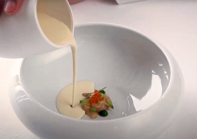 Sobre estas líneas podéis ver el servicio de un plato de alta cocina, propio de un menú degustación de un distinguido restaurante, se trata del Calamar con emulsión de cordero y gazpachuelo de anguila de Ismael Ramos, chef del restaurante Mantúa de Jerez de la Frontera (Cádiz), reconocido con una estrella Michelin en la guía roja de este año. Y como no, dado que podéis ver la elaboración paso a paso porque sumamos esta creación culinaria en la sección ‘Recetas de los Chefs‘, os animamos a que la pongáis en práctica, pues vais a presentar a vuestros comensales un platillo para disfrutar en tres cucharadas, sabroso y sorprendente.