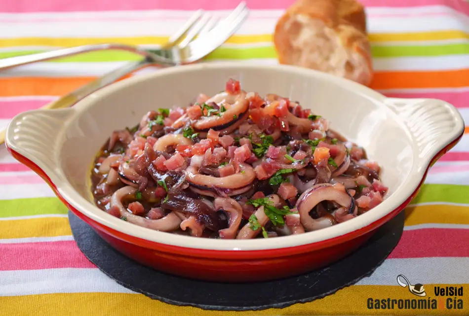 Es una tapa o plato muy sabroso a la vez que humilde y sencillo, sólo hay que seleccionar una buena cebolla, en este caso utilizamos una cebolla morada, y unos calamares frescos que garanticen que van a resultar tiernos y nos van a regalar el sabor del mar. Contrastará genial con unos pequeños dados de jamón y con un buen pan para mojar en la salsa que quede en la cazuelita. Seguro que tenéis un buen albariño para mojar estos calamares encebollados.
