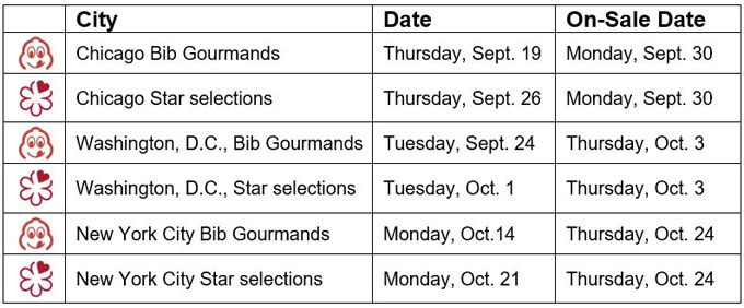 En este calendario se muestran las fechas para la presentación de los listados Bib Gourmand y las guías, se sigue la tónica del año pasado de dar a conocer las guías en un periodo espaciado abarcando el mes de septiembre y el mes de octubre, mientras que anteriormente se presentaban todas las guías en el mismo mes. También se sigue la misma línea en cuanto al orden de presentación, primero se da a conocer el listado de restaurantes Bib Gourmand y una semana después la guía con los restaurantes que reciben nuevas estrellas.