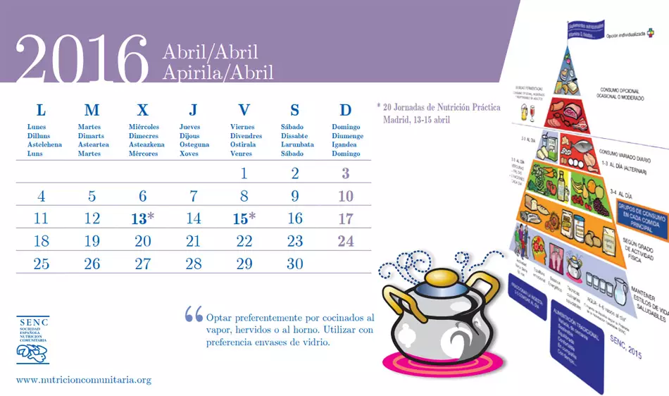 La importancia del equilibrio o balance energético fue el tema del mes de marzo en el Calendario Saludable: ‘Es muy recomendable movernos y comer en sintonía y equilibro, para que nuestra composición corporal sea más adecuada’. Mientras que en abril, la recomendación se centra en las técnicas de cocción saludables: ‘Optar preferentemente por cocinados al vapor, hervidos o al horno. Utilizar con preferencia envases de vidrio’.