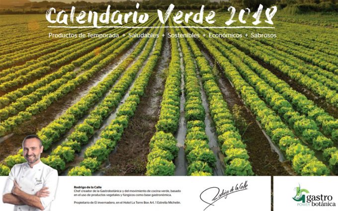 Rodrigo de la Calle, que hasta hace poco era el chef del Restaurante El Invernadero de Collado Mediano (Madrid), reconocido con 1 estrella Michelin, ha creado doce platos para el Calendario Verde 2018, un calendario que pretende mostrar a sus usuarios cuáles son los productos que están de temporada durante cada mes. Al tratarse de productos frescos, de alimentos que nos da la tierra, se habla de productos saludables, sostenibles, económicos y sabrosos.