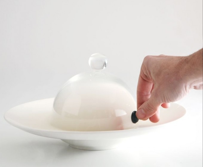 No es una campana de cristal cualquiera, la Aladin cover cuenta con una válvula de inyección automática para conectar la pipa de humo Aladin, de este modo el humo, el vapor o los aromas pueden introducirse en el plato sin necesidad de levantarla, resultando un proceso más eficaz. El interior de la campana se llena de humo ligero realizado a baja temperatura y los aromas naturales se respetan más.
