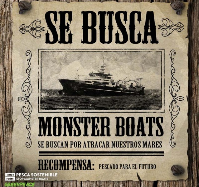 Se conoce como Monster Boat a aquellos enormes barcos de pesca capaces de capturar hasta 350 toneladas de pescado en un sólo día, estas capturas no son selectivas y arrasan con todo lo que se encuentran en los fondos marinos. Muchos ejemplares de especies de gran valor biológico pero sin valor comercial, son capturadas por estos barcos de gran tonelaje y posteriormente arrojadas por la borda, en la mayoría de casos muertos. Según explica Greenpeace, la pesca ilegal no declarada y no reglamentada es común en este tipo de barcos.