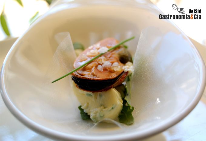 Lava las hojas de rúcula y sécalas bien, en contacto con el obulato no debe haber líquidos, pues se fundiría. Dispón sobre la mesa de trabajo los discos de obulato y coloca en el centro de cada uno tres hojas de rúcula, sobre ella coloca una cucharadita de mantequilla compuesta, a continuación el mejillón y sobre éste, unas escamas de sal.