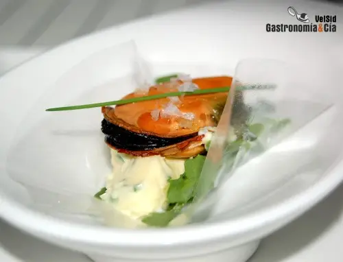 Lava las hojas de rúcula y sécalas bien, en contacto con el obulato no debe haber líquidos, pues se fundiría. Dispón sobre la mesa de trabajo los discos de obulato y coloca en el centro de cada uno tres hojas de rúcula, sobre ella coloca una cucharadita de mantequilla compuesta, a continuación el mejillón y sobre éste, unas escamas de sal.