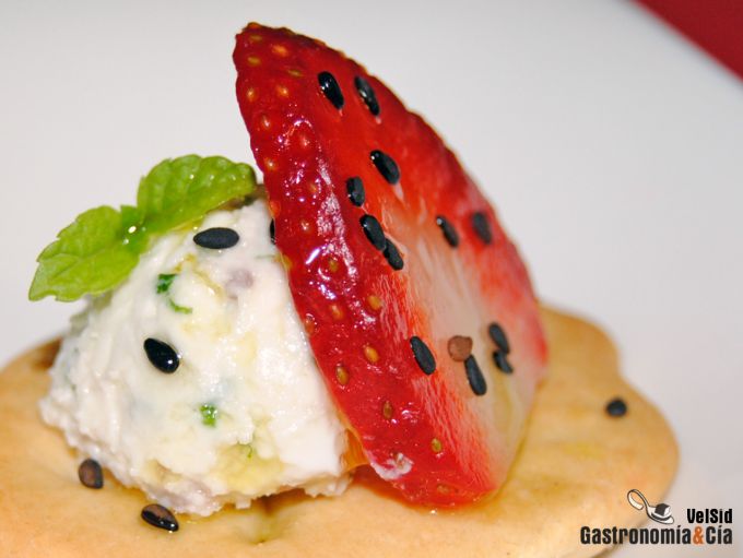 Lava las fresas o fresones y después retírales el pedúnculo, a continuación córtalas en láminas no muy finas. Sirve una rodaja de fresa junto al paté de feta y anchoa. Espolvorea unas semillas de sésamo negro, decora con unas hojitas de hierbabuena o con cebollino y termina con unas gotas de aceite sobre la fruta y el queso.