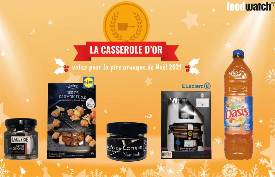 Hoy conocemos otra iniciativa muy similar puesta en marcha por Foodwatch Francia, pero centrada en los productos alimenticios que se presentan como ideales para disfrutar de un magnífico menú navideño. La organización ha presentado los candidatos al Premio a la mentira publicitaria navideña más insolente del año 2021, se trata de cinco productos que se presentan de un modo pomposo, pero que son un fraude al consumidor y que son merecedores de ganar la Casserole d’Or 2021 (Cazuela de Oro 2021).