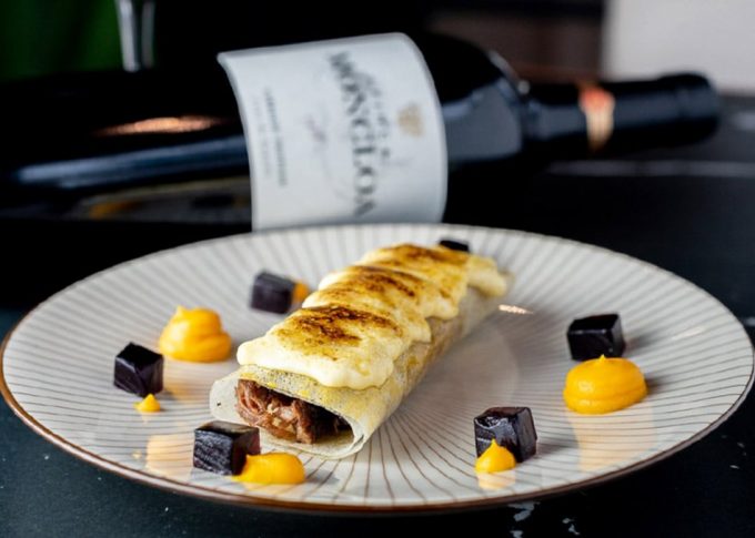 Hornear el canelón hasta que la pasta brick esté crujiente y servir en el centro del plato, napar con la emulsión de trufa y tostar con el soplete de cocina. Acompañar de unos dados de vino y la crema de calabaza.