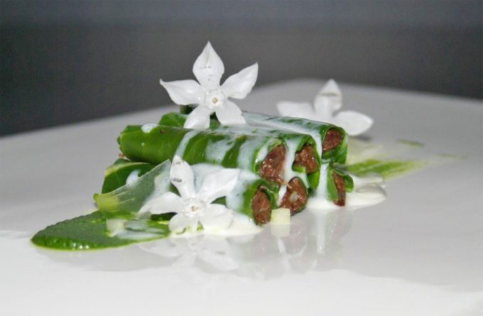 El chef de La Casona del Judío de Santander, además de ser un apasionado de los producto vegetales, trabaja sus creaciones desde el sabor, desde la estética, desde la técnica y entre otras cosas, seleccionando productos de proximidad. De nuevo tenemos un plato ‘verde’ de Sergio Bastard que, además, es muy económico como podréis comprobar en cuanto veáis los ingredientes. En la foto luce el Canelón de berza pasiega y morcilla del cocinero catalán, santanderino de adopción.