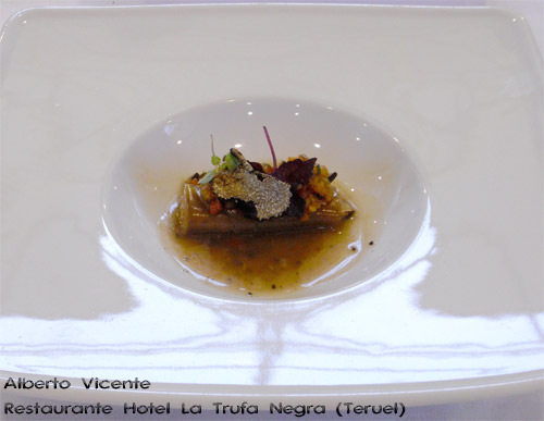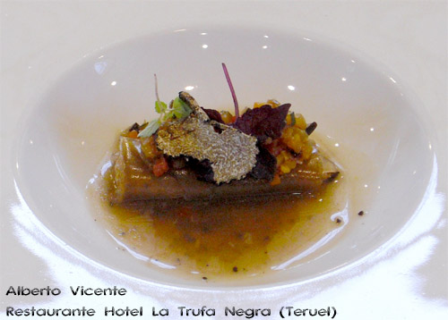 Alberto Vicente, chef del restaurante del Hotel La Trufa Negra de Teruel, se alzó con el primer premio del concurso con esta receta de Canelón de consomé de Ajo frente a un selecto jurado, entre los que se encontraban Mario Sandoval (Restaurante Coque), Manuel de la Osa y Erlanz Gorostiza (Restaurante Las Rejas).