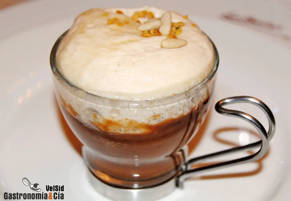 Ahora también podréis probarlo vosotros y sin salir de vuestra cocina, aunque ya os adelantamos que no será igual, pero siempre será una satisfacción hacer el Capuchino de morcilla con praliné de piñones y espuma de pan de Miguel Ángel de la Cruz, y con él sorprender a vuestros invitados. Podréis servirlo como un elegante aperitivo en una comida especial, pues es fácil de hacer, tomad nota de la receta.