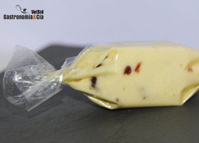 Sirve los caramelos de aceite de oliva y cecina en la bandeja o platillos de aperitivo e invita a tus comensales a comer los caramelos sin retirar el ‘papel’, ya que éste se fundirá en el paladar.