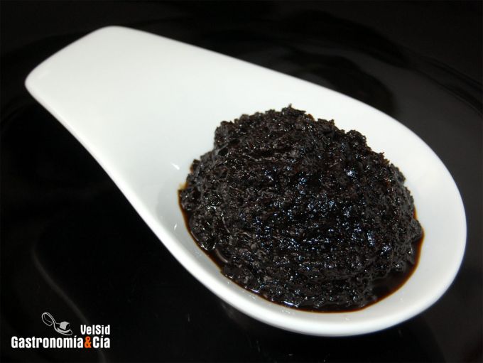Hemos preparado el Caramelo de aceituna negra para acompañar un pescado en la comida de hoy. Es una elaboración de Ferrán Adrià que aparece en uno de los libros de Cocina con firma, pero hemos modificado algunas cosas a falta de glucosa y además, vimos esta elaboración cuando la hicieron Luis Arrufat y Pablo Pavón en el Restaurante de El Corte Inglés de Castellón.