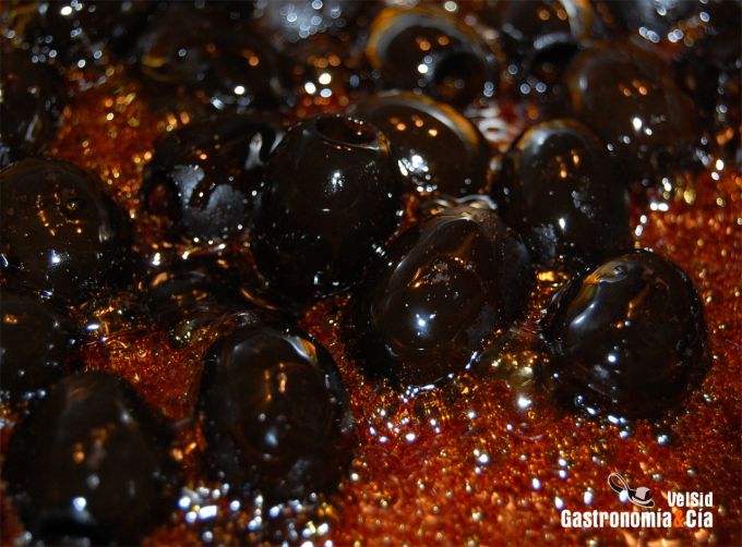Pon en un cazo el agua con el azúcar y haz un caramelo oscuro. Incorpora las aceitunas negras y deja que se caramelicen, ve moviéndolas para que lo hagan en todo su contorno.