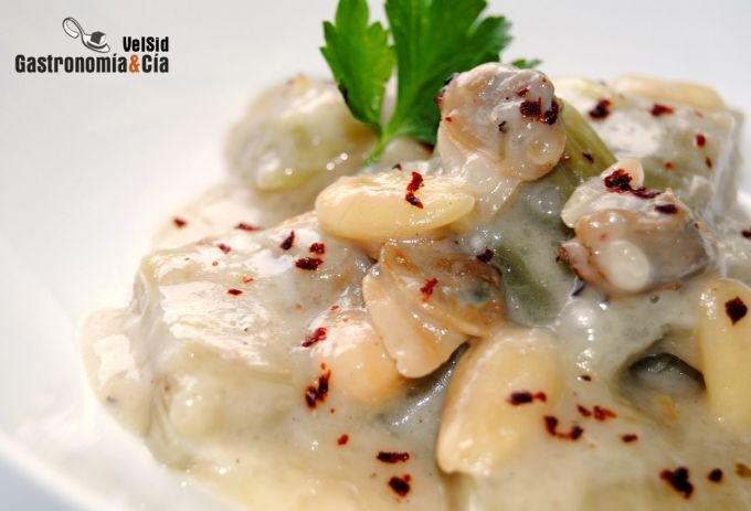 Cuando la salsa velouté empiece a espesar añade las almendras, los cardos y las almejas, deja cocer un minuto más para que se integren los sabores y retira del fuego.