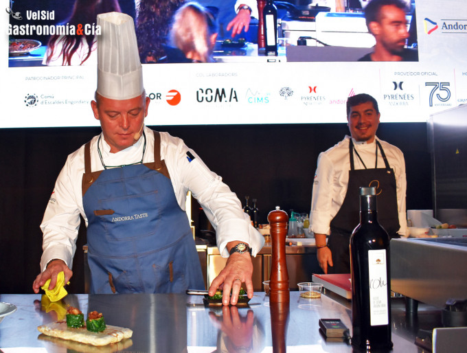 Y así fue, nos contó que con su formación en casa y en la escuela, y tras su paso por los fogones de maestros de la alta cocina y de vanguardia como Akelarre de Pedro Subijana, su dote está en elaborar cocina tradicional actualizada con nuevas tendencias, y nuevas formas de presentar los platos, pero siempre con un respeto al recetario tradicional de la gastronomía andorrana. Para ilustrar a los asistentes a su ponencia, nos mostró la elaboración de tres platos, empieza con una sopa tradicional del país, una crema de ortigas con la que hace el juego del ‘mar y montaña’ añadiendo pez mantequilla y un poco de caviar, para darle más chispa.