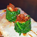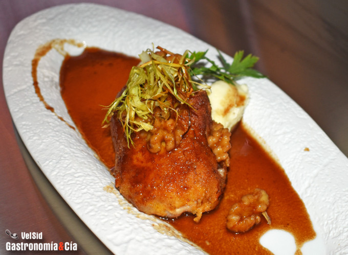 Las manitas de cerdo son un clásico de Can Manel desde hace años, las hacen deshuesándolas y rellenándolas con langostinos, gambas, setas, crema de leche y yema de huevo, así queda bien cuajado. Después reboza y fríe y acompaña de la salsa agridulce con unas nueces. Emplata con puré de patata y trufa, un crujiente de puerro y no necesita nada más, ¿verdad? Podéis ver el resultado en las fotos, como el de todos los platos presentados por Carles Flinch, entre ellos tenéis uno de los bocados que probamos en la cena y que realmente nos gustó, es un tradicional trinxat de col que presenta como si fuera sushi, si lo queréis probar, ya lo sabéis, lo tenéis en Can Manel.
