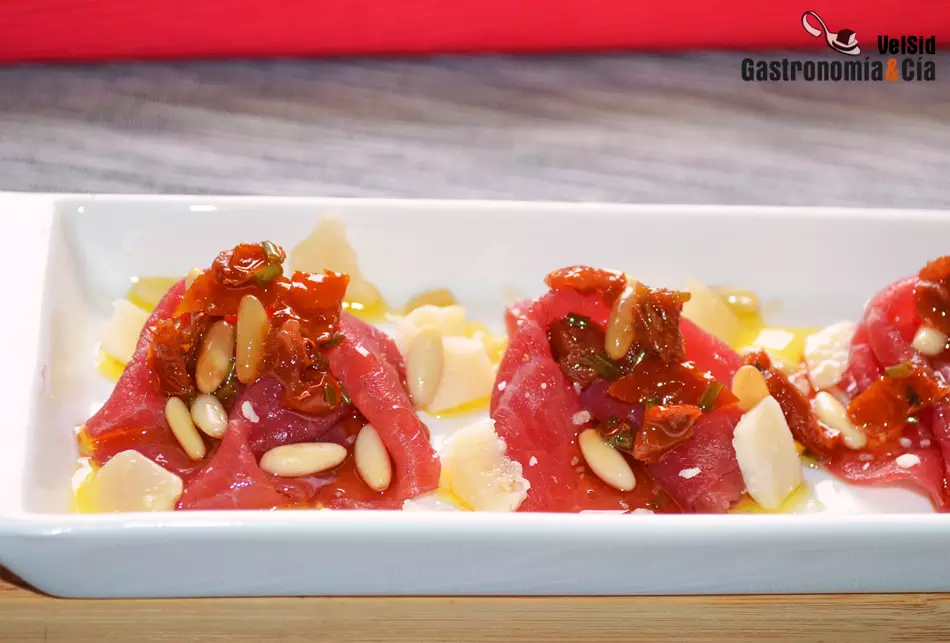 Para los amantes de la carne y para quienes disfrutan de este alimento crudo, tener un carpaccio de aperitivo es un placer. Y aunque no necesita nada más que un buen aceite de oliva virgen extra y un poco de queso parmesano, u otro queso curado al gusto, también hay otras formas de condimentarlo para sorprender y saborear algo diferente. Una nueva propuesta que tenemos para vosotros es este Carpaccio de buey con vinagreta de tomate seco y piñones.