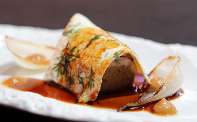 Marcamos los carrillones rellenos en una sartén hasta que estén bien calientes y obtengan un agradable tono dorado. Los colocamos en un plato caliente y disponemos sobre estos una cantidad generosa de salsa de achicoria. Finalmente colocamos el velo de leche de oveja con los elementos vegetales en la parte superior. Servimos caliente, acompañado con cebollas asadas y toffee de cebolla.