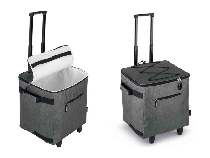 El carro refrigerado que podéis ver en las fotos es de Lidl, y tiene una buena relación calidad-precio, su capacidad aproximada es de 40 litros, soporta un máximo de 14 kilos (quizá a algunos se os queda corto) y su función de refrigeración tiene una duración de cuatro horas. El material del carro de compra isotérmico de Lidl es poliester y EVA, y su estructura es de aluminio, además, es plegable, lo que se agradece para poder guardarlo en cualquier pequeño espacio en casa.