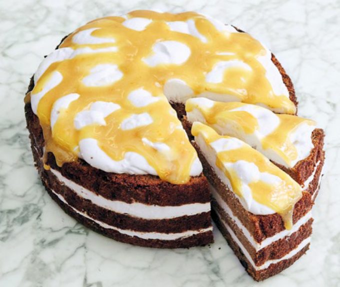 Cortar el bizcocho de zanahoria en tres partes, rellenar y cubrir con la crema de coco y terminar con la salsa de naranja.