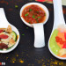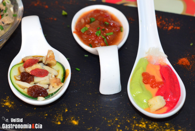 A continuación nos presentaron un plato con cinco degustaciones deliciosas, podéis verlas servidas en cucharillas, empezando por el Hummus tradicional, que no podía faltar, junto a otro imperdible como es el Baba Ghanoush, además un Carpaccio de calabacín con vinagreta de mostaza, miel y frutos secos, la Salsa kaila, que no la conocíamos pero es una salsa de tomate especiada, y para terminar, un Salmorejo a las tres culturas, tradicional, con remolacha y con espárragos.